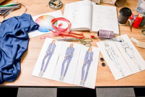 A simple sketch will usually look more like a paper doll than a dress on a real person. The line will be hesitant, the shape stiff, and the fabric flat. This will be because you’re sketching the outline before thinking about the way the fabric looks on a person. So instead of drawing a line, think of the weight of the fabric, and gravity pulling it down. The skirt would fall away from the waistband, the sleeves will crease as they bend at the elbow, and soft fabric will rumple where the tension is released. It can be helpful to just draw a basic outline of the body, and then superimpose the clothes on it, even if it’s just a stick figure. The result will be more lifelike than a dress hung in mid-air.